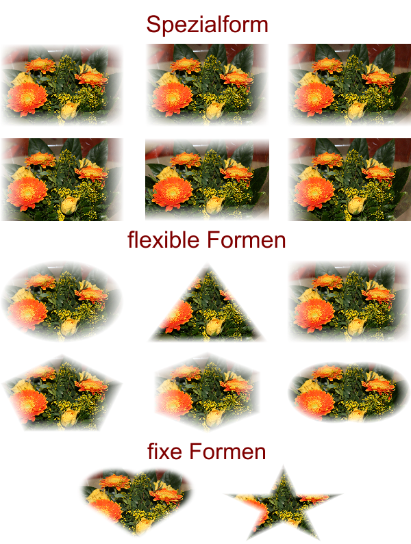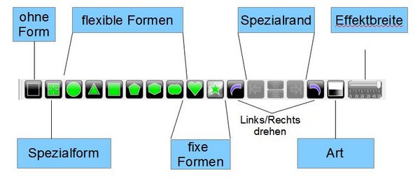 ohne Form: Das gesamte Bild wird behandelt. Über den Regler "Effektbreite" kann die Stärke des gewählten Effektes eingestellt werden. Bei 50 verschwindet das Bild im "ausblenden"- Modus vollständig.