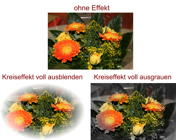 Grundsätzlich gibt es zwei Arten, die einen Effekt ausmachen. Die erste Art lautet "ausblenden" und entspricht auch der Standardeinstellung. Dabei entspricht der gewählte Effekt einem Übergang zur Transparenz im Randbereich. Das Bild verschwindet quasi. Wenn diese Art aktiv ist, ist der Schwarz/Weiß Button zu sehen, da bei dessen Betätigung die Art zum "ausgrauen" wechselt.